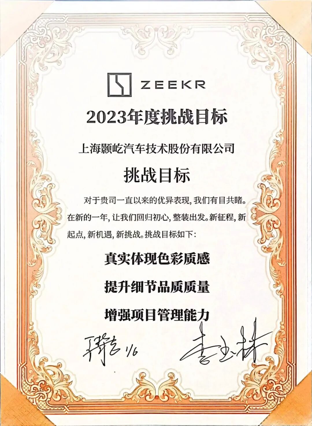 上海颢屹汽车深耕汽车领域十余年,在行业内的创新能力、技术先进水平和产品质量、技术储备、人才储备等深受极氪汽车的认可,正因如此,极氪汽车此次与上海颢屹汽车签订了”2023年度挑战目标“,意味着2023年上海颢屹汽车与极氪汽车将继续深度合作,共同进步,一起竭力为汽车领域的发展做贡献!