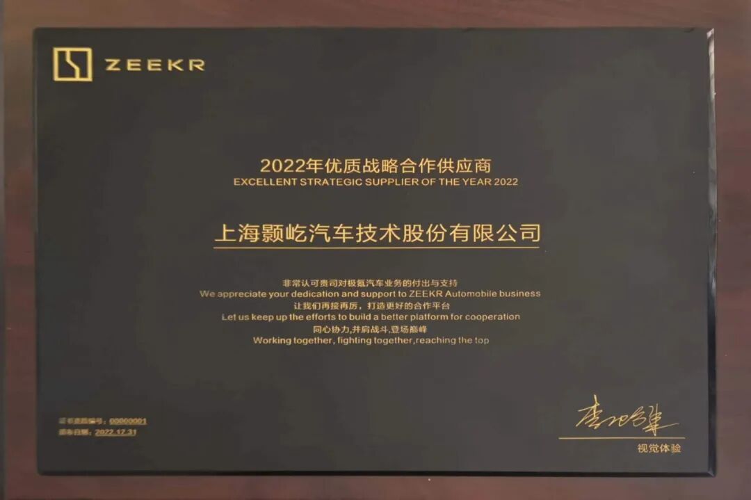 上海颢屹汽车 | 荣获极氪汽车“2022年优质战略合作供应商”称号